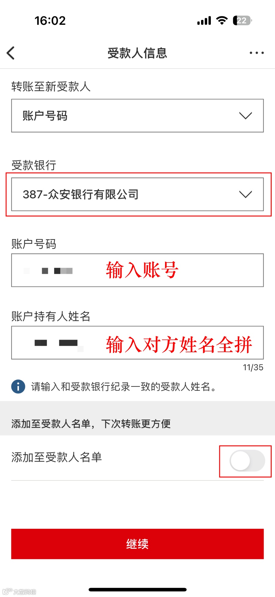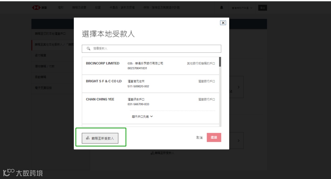 - 点击「转账至新受款人」→ 转账类别选「银行户口」→ 银行名称输入