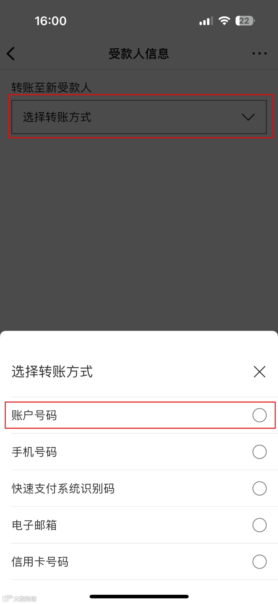 - 选择账户号码作为转账方式 → 选择收款银行 → 输入金额及日期