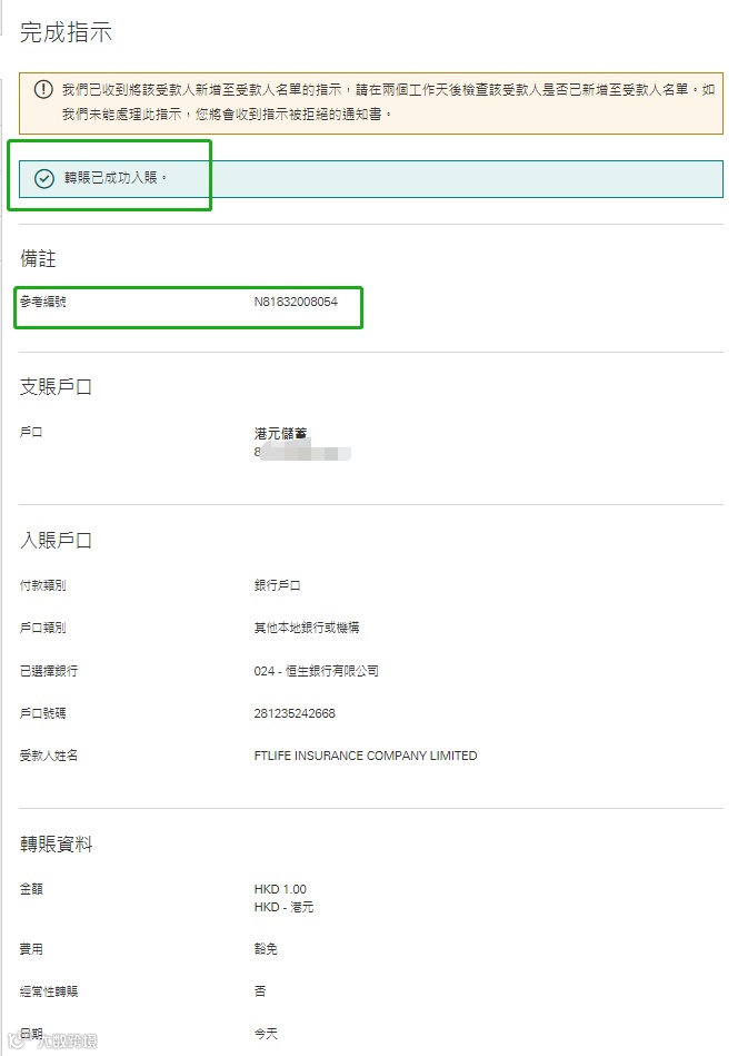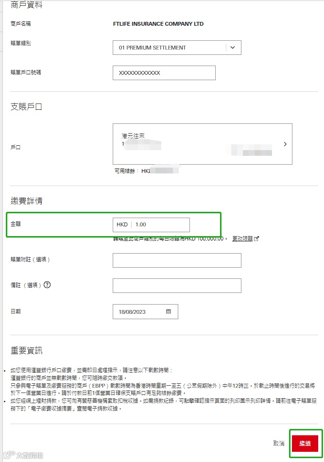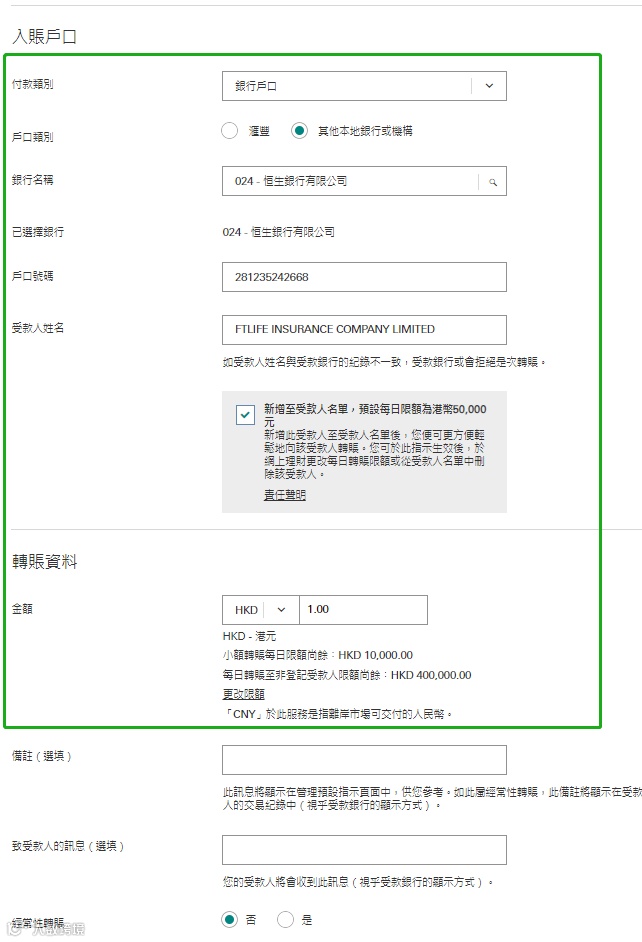 - 选择港元储蓄户口,填写缴费金额,备注栏可填入保单号