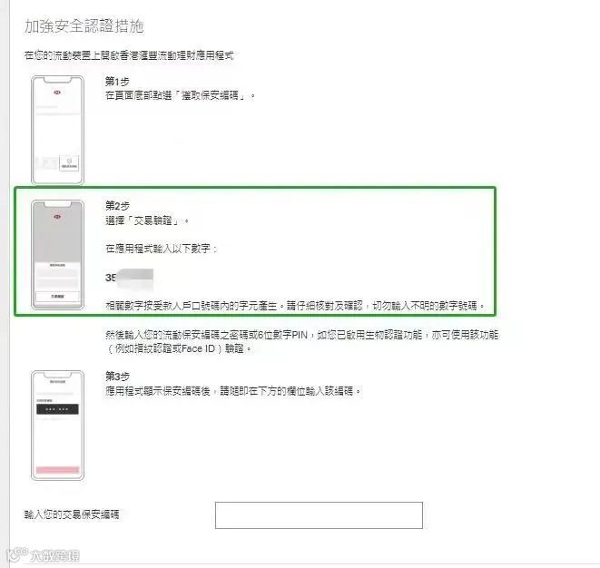 7、打开手机银行APP获取保安编码,点击「交易验证」,输入已生成的保安编码,即可完成转账