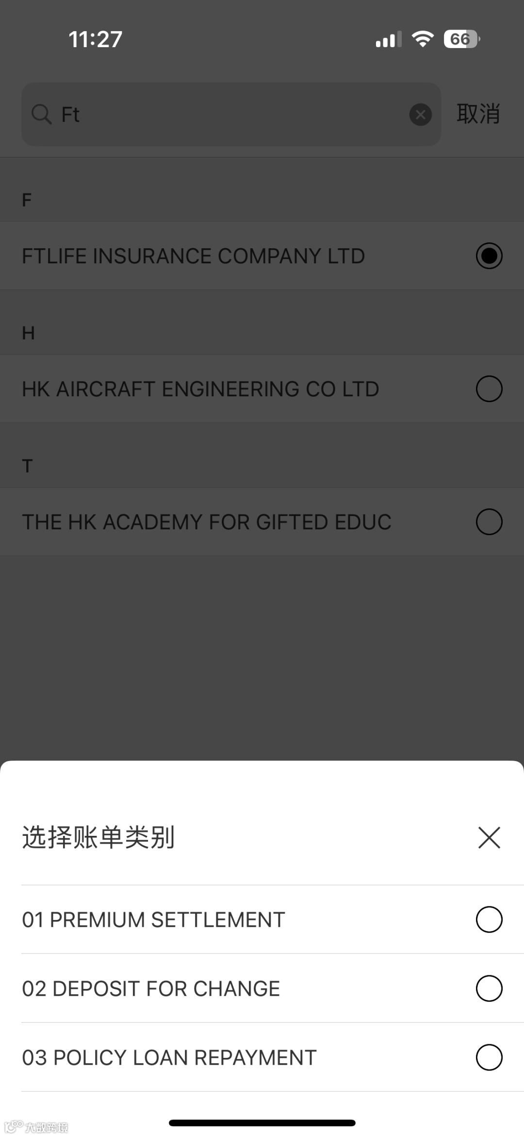 - 账单类别选择「01 PREMIUM SETTLEMENT」,输入保单号