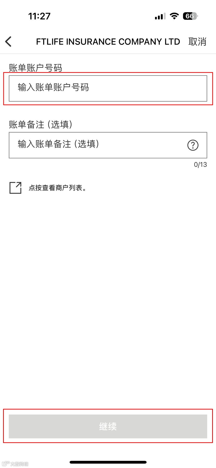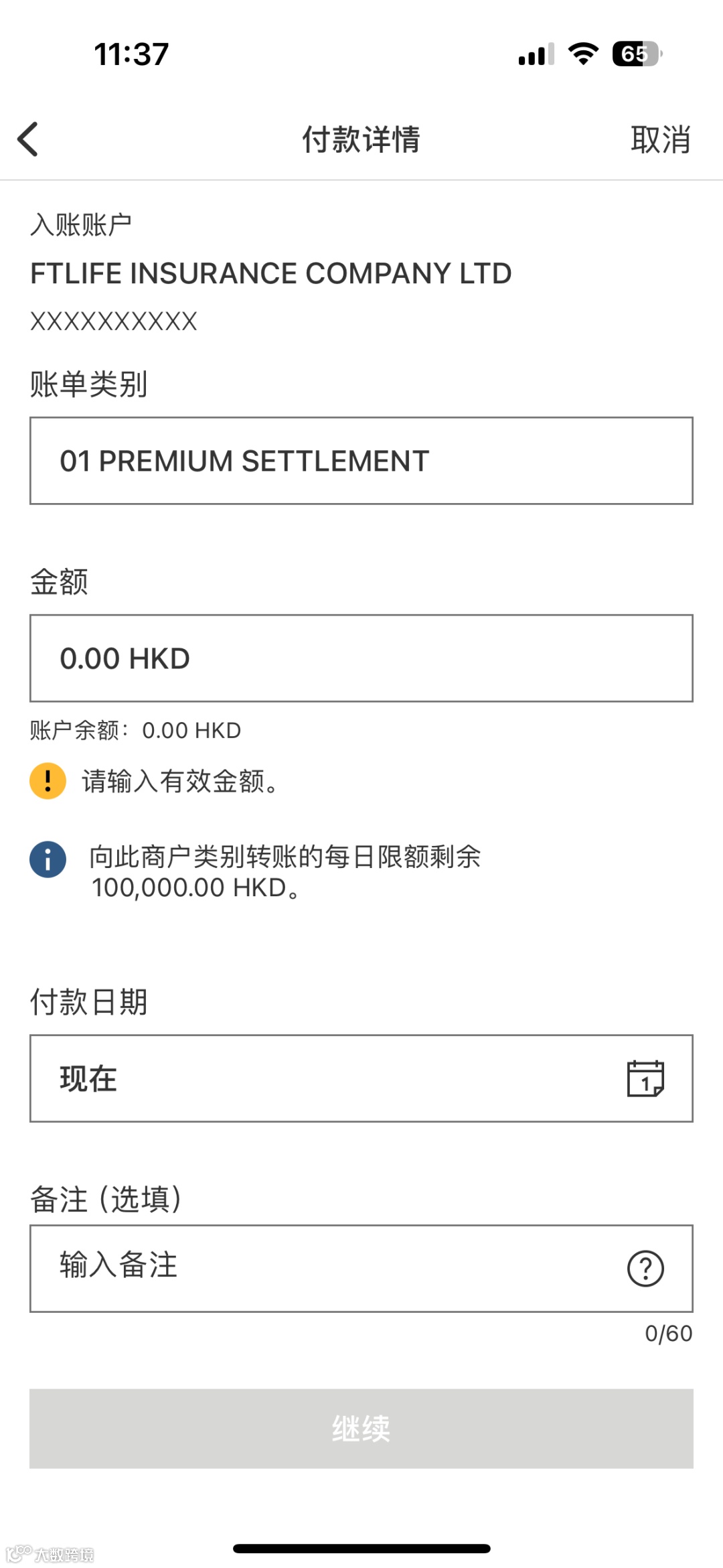 - 填写金额,备注栏建议填写保单持有人及编号,点击「继续」并进行手机验证