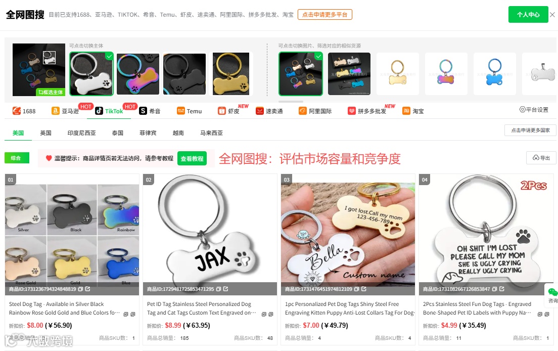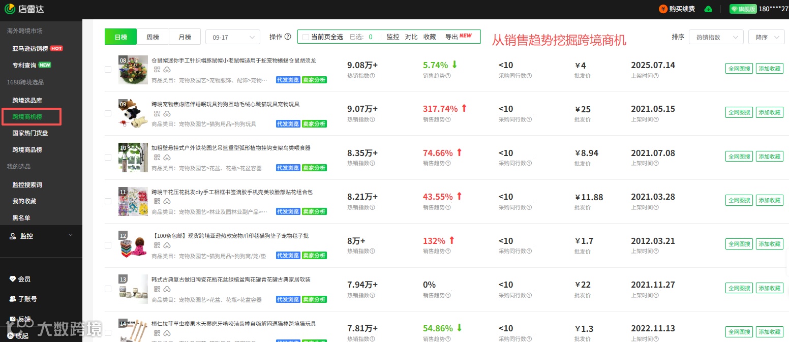 卖家可以通过店雷达跨境商机榜,例如热销指数、销售指数有所上升,说明近期需求有所上涨,卖家可以挖掘一些上升幅度较小的,在用全网图搜验证市场容量,竞争度是否过大,避开红海产品。
