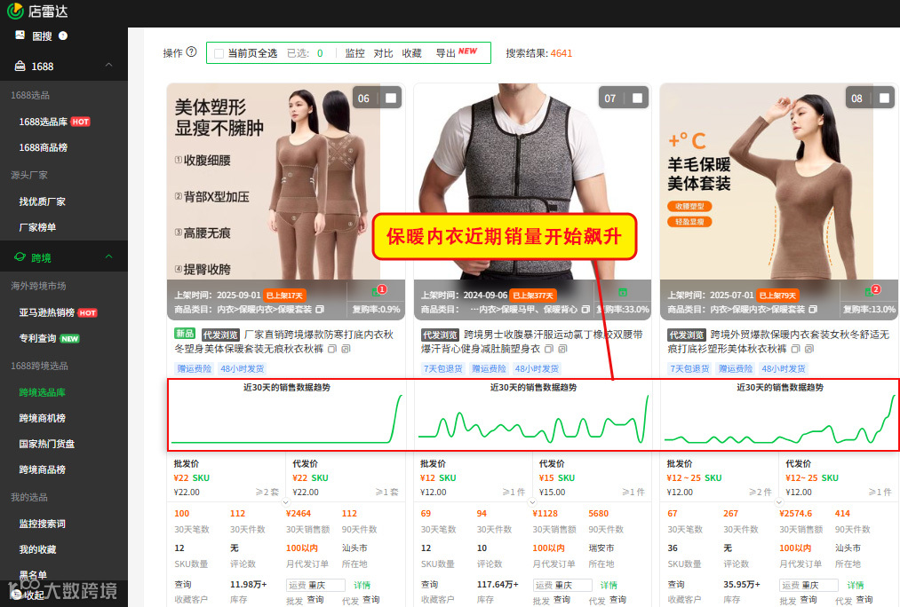 ①季节转换刚需:9-10月正逢秋冬交替之际,从店雷达跨境选品库数据显示,保暖内衣近期销售趋势正在飙升,选品时可以从厚袜子等保暖类产品及小型取暖器等家居舒适品发散,此类商品不仅需求集中,利润也相对较高。