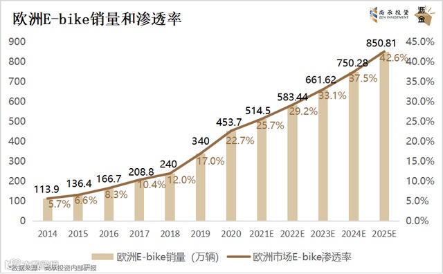 根据Grand View Rearch的数据,2021年全球电动自行车市场规模为178.3亿美元,预计2022年至2030年的复合年增长率(CAGR)将达到13.5%。E-bike在欧洲的渗透率也在逐年增加,预估至2025年渗透率将提升到42.6%,未来几年的复合增速也将保持在13.34%的高速上,德国是整个欧洲销量最大的市场,占比达34.5%。