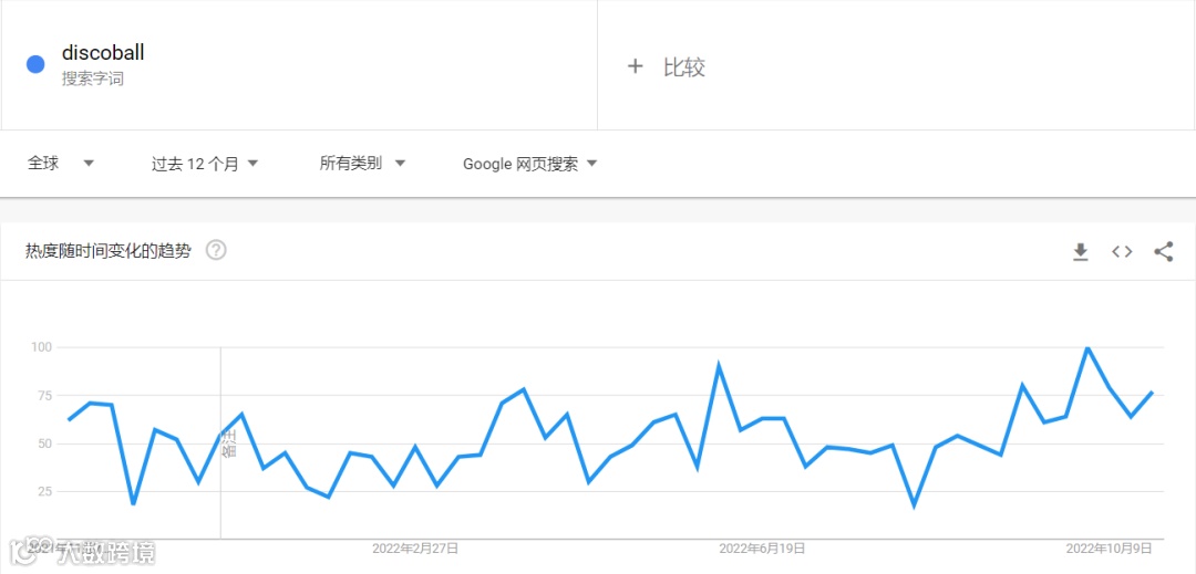 谷歌趋势显示,在过去12个月里,“discoball”在全球范围内的搜索指数,有相当一部分时间保持在50以上,且在9月末至10月初的时间里,热度指数一度攀升至100。