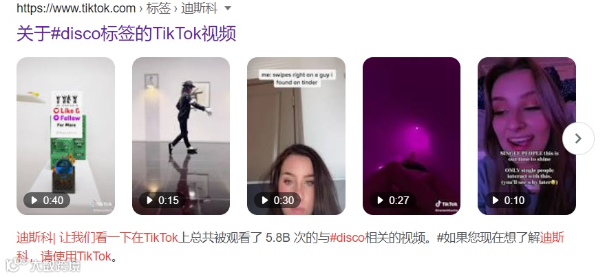 谷歌搜索显示,在Tik Tok平台,与#disco话题相关的视频,总计被观看58亿次;与#discoball相关的视频,总计播放量达2.276亿次。