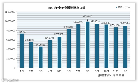 中国一直是鞋靴出口大国,商务部数据显示,2021年,中国出口鞋靴金额479亿美元,同比增长35%。从区域布局看,福建、广东仍是中国鞋靴出口前两大省份,2021年前11个月出口额合计占中国鞋类出口额的44%。