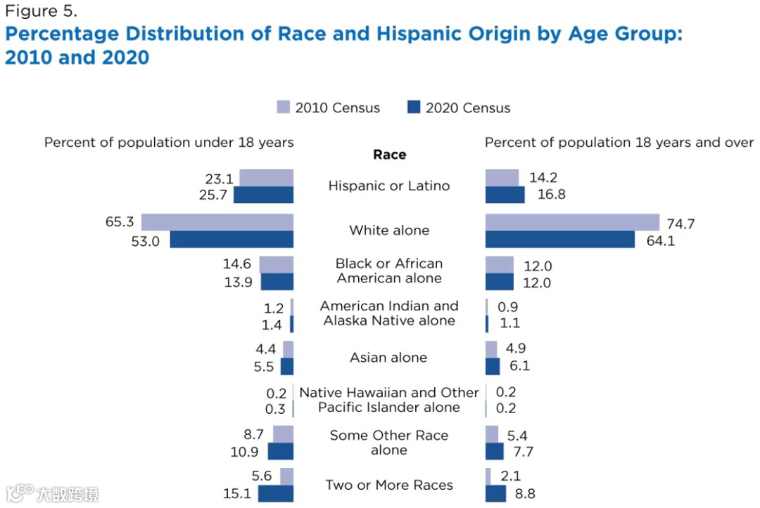 这一趋势源于青年群体结构变化:2010至2020年,未满18岁人群中,白人和黑人占比分别下降12.3%和0.7%,而西班牙裔/拉丁裔和亚裔分别上升2.6%和1.1%。
