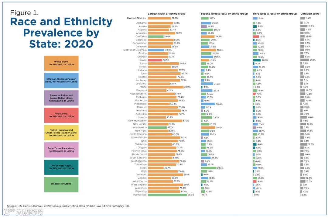 美国各州族裔结构差异显著。2020年,除加州(西班牙裔/拉丁裔占39.4%)、哥伦比亚特区(黑人占40.9%)、夏威夷州(亚裔占36.5%)和新墨西哥州(西班牙裔/拉丁裔占47.7%)外,其余州最大族裔均为白人。