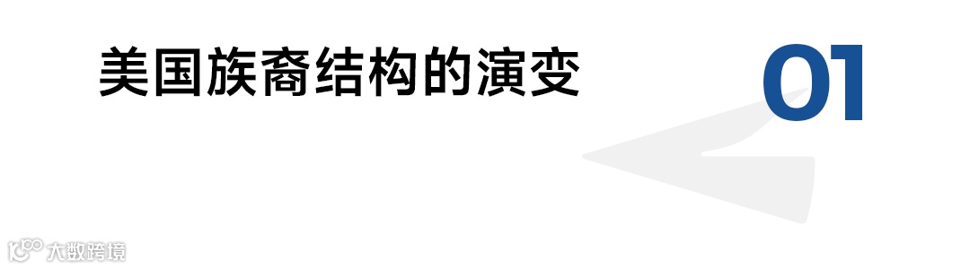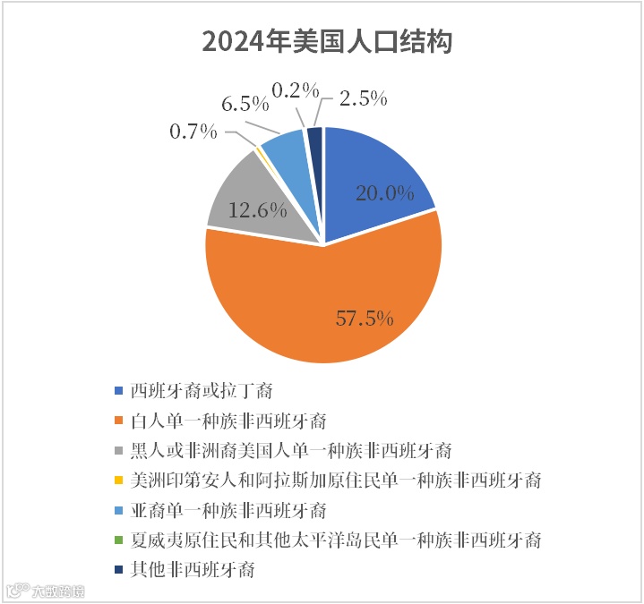 截至2024年,美国前三大族裔依次为白人(57.5%)、西班牙裔/拉丁裔(20.0%)和黑人/非裔美国人(12.6%)。 亚裔虽基数较小(6.5%),但增速仅次于西班牙裔/拉丁裔。黑人/非裔美国人占比仅微增0.4%。
