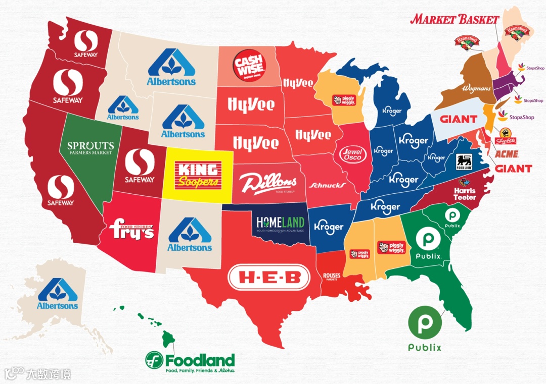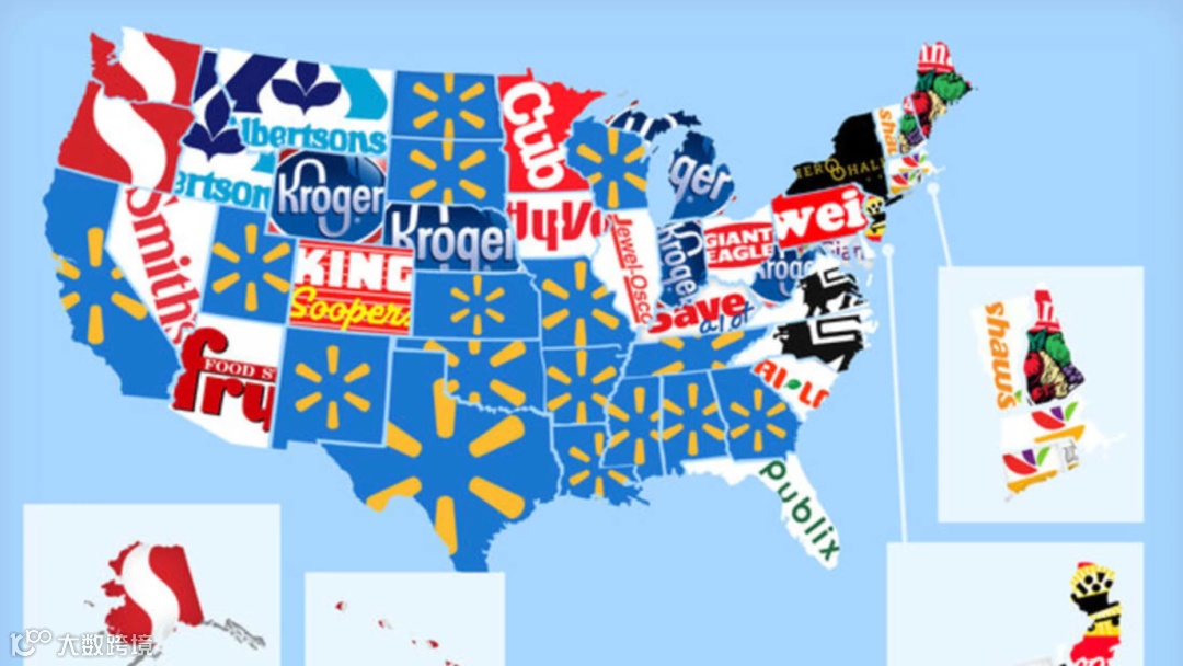 2016年,美国人最常光顾的品牌为Walmart(16个州居首)、Albertsons/Safeway(7个州居首)和Kroger(5个州居首)。