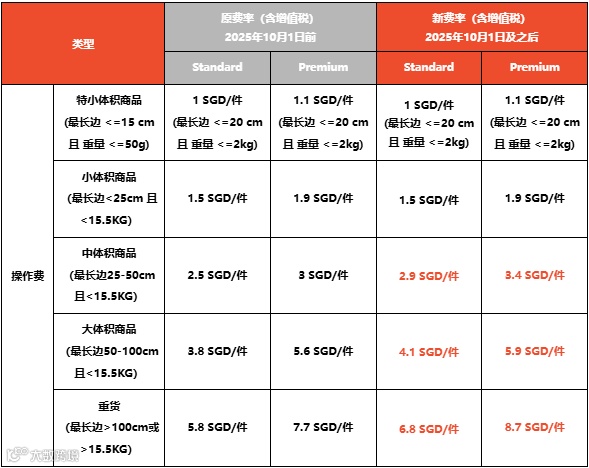 注: 1. 费率单位为新加坡币(SGD)。 2. 新费率仅适用于2025年10月1日后生成的订单。