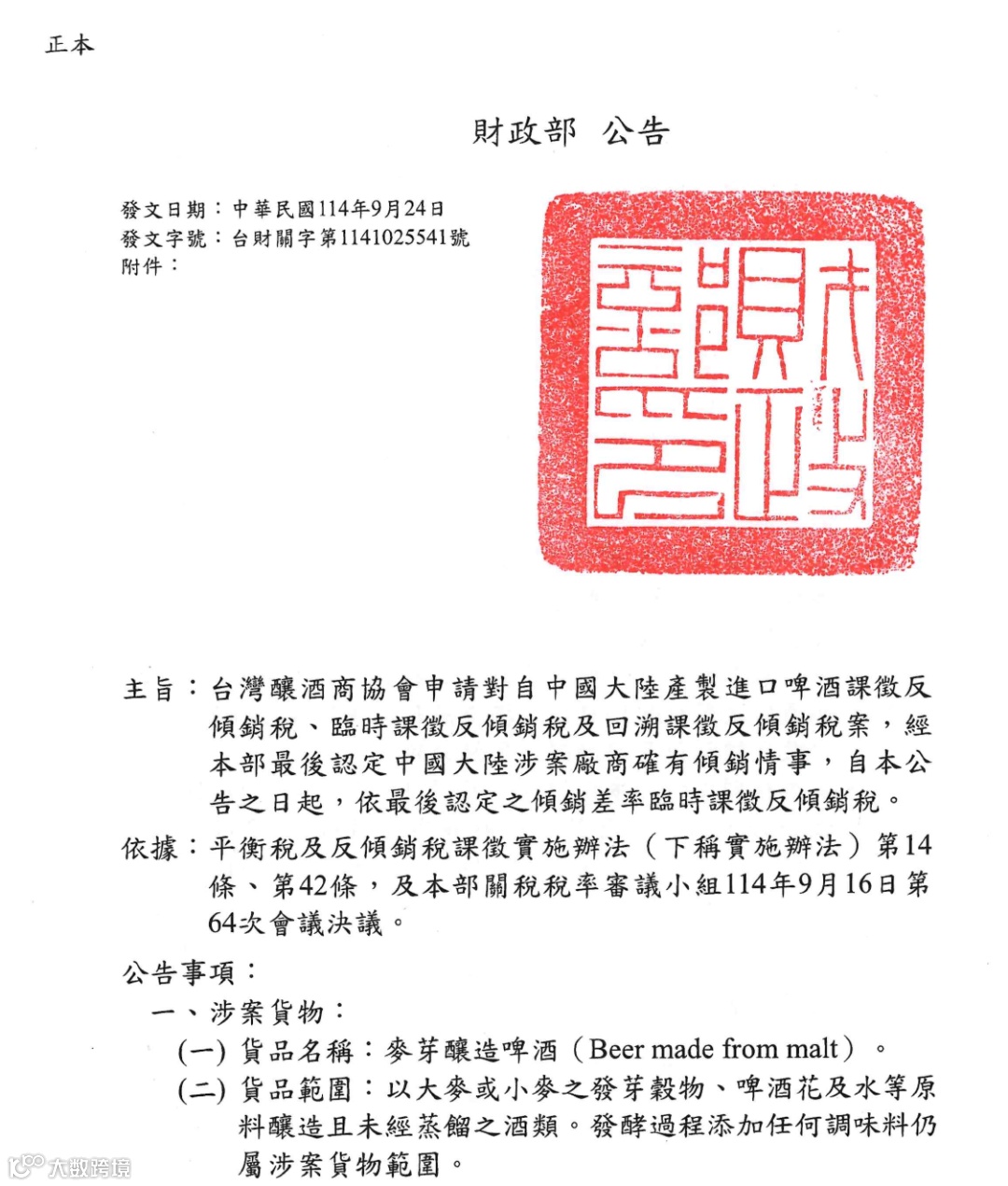 台湾发布啤酒反倾销终裁 道岳助力珠海麒麟获19%最低税率