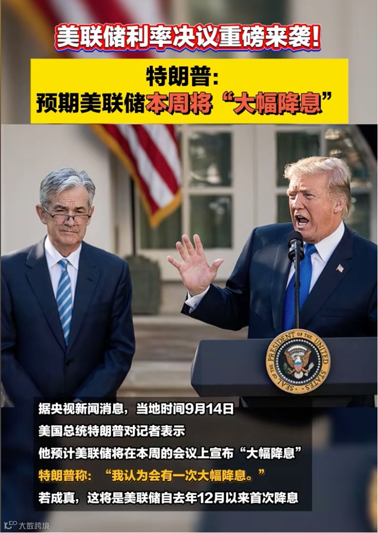 当地时间9月14日,美国总统特朗普对记者表示,他预计美联储将在本周的会议上宣布“大幅降息”。