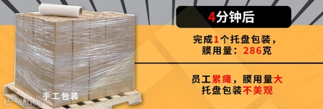 采用自走式缠绕机,包装速度90米/分钟,一般只需要2分钟左右即可缠绕好一个托盘,完成一个托盘包装的膜用量大概在150克左右,相比人工托盘缠绕膜时间减少一半,用膜量减少60%以上。
