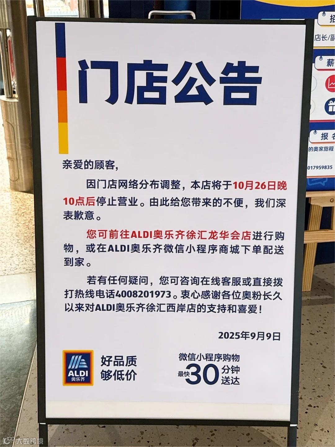 奥乐齐西岸凤巢店将于10月26日闭店