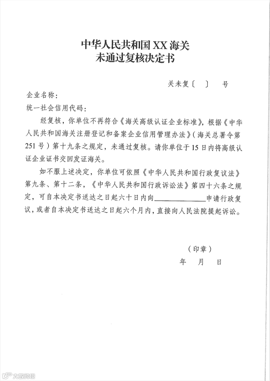 通过复核的企业,海关将制发《通过复核决定书》;未通过复核的,将制发《未通过复核决定书》,停止适用高级认证企业管理措施,恢复常规管理,并收回《高级认证企业证书》。