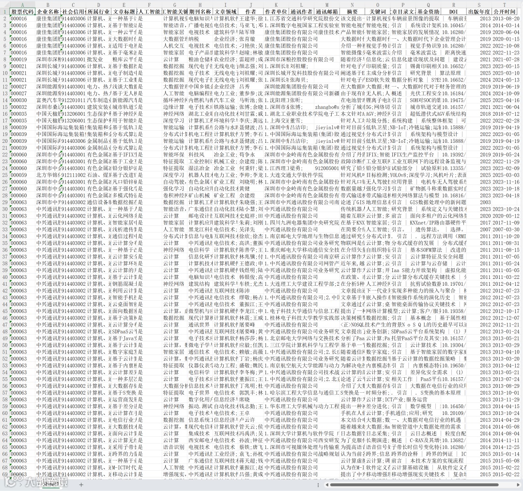 数据涵盖企业名称、文章标题、是否为人工智能主题、人工智能关键词、论文摘要、关键词及来源期刊等关键指标。