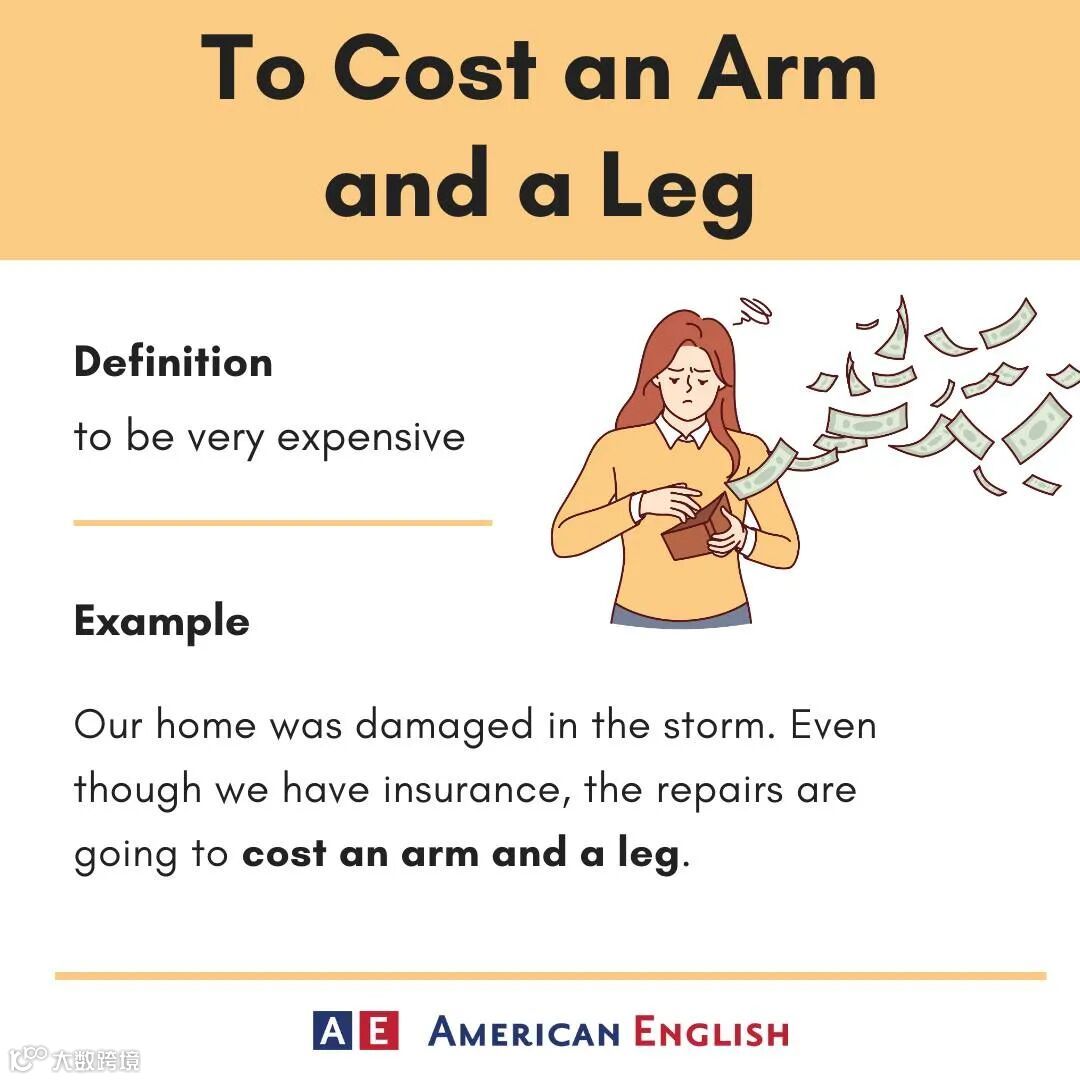 “To cost an arm and a leg” 意为某物极其昂贵。该俗语源于一种夸张表达:为了负担某样东西,甚至需要牺牲身体的重要部分——如胳膊和腿——来换取,以此强调价格之高。