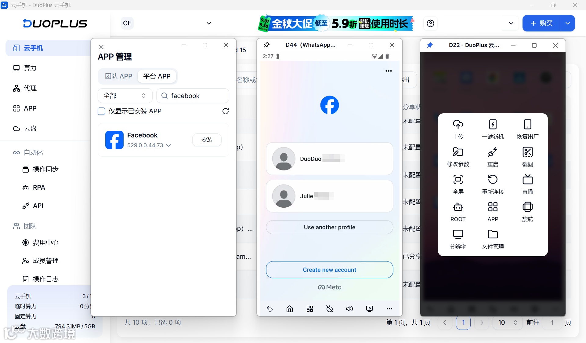 如果是同时运营多个Facebook账户,使用DuoPlus云手机可以实现低成本批量管理账号,通过独立设备环境和IP来安全隔离账号,能够避免关联风险。