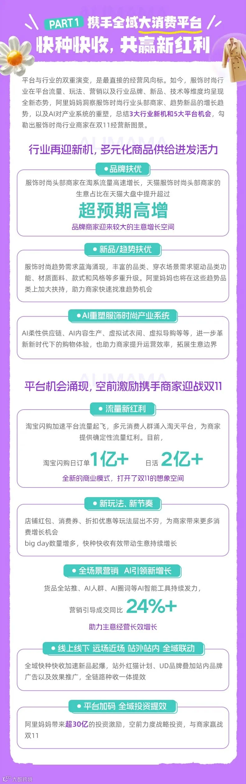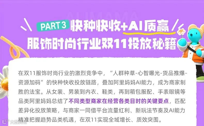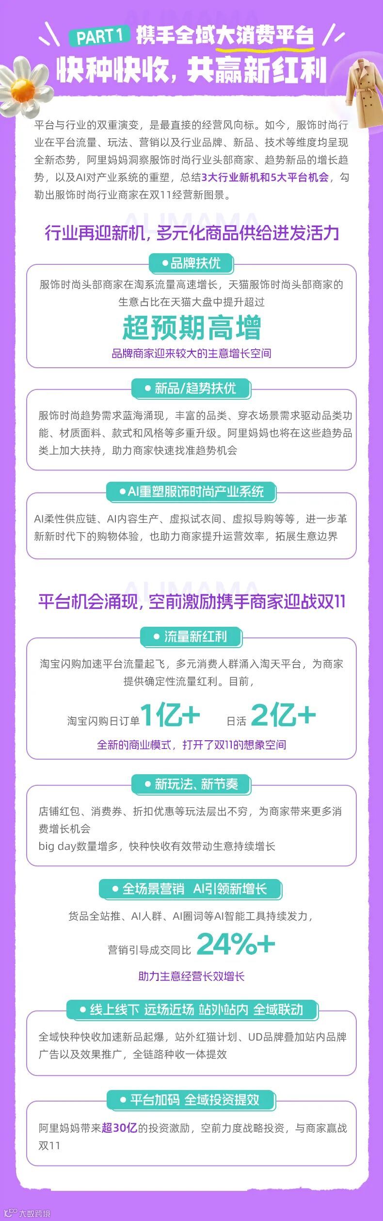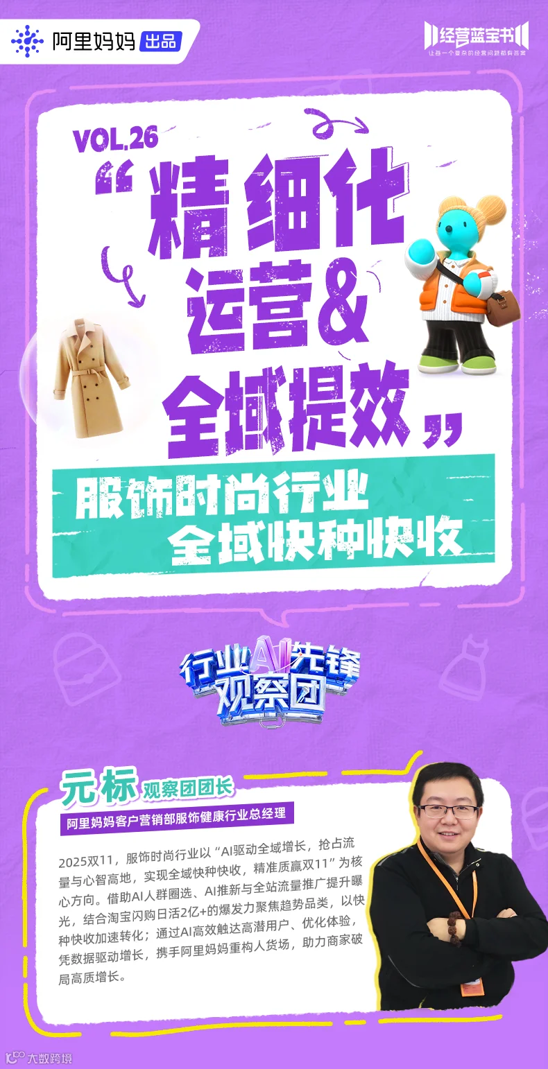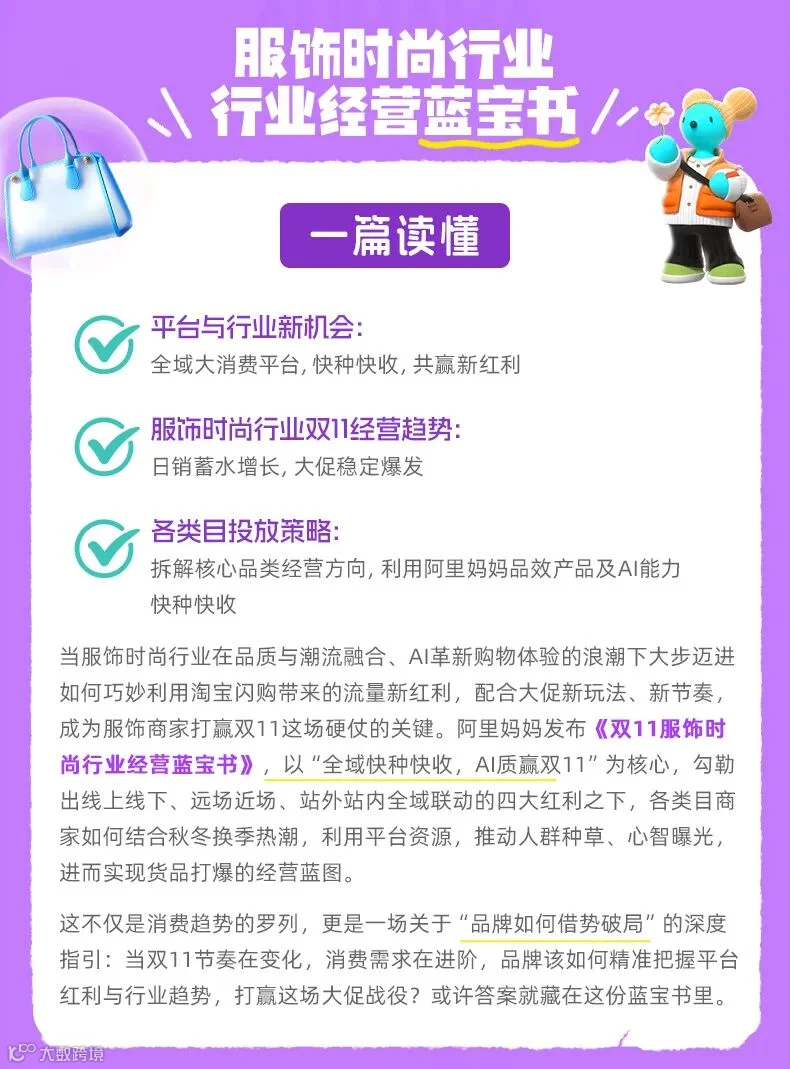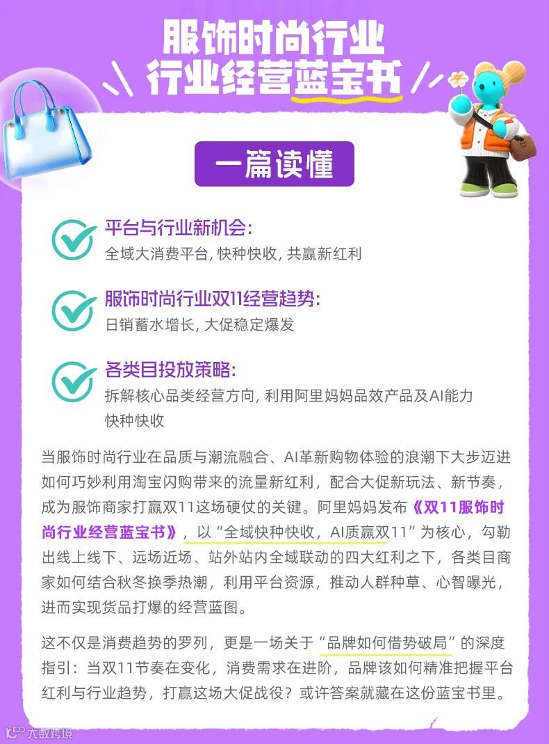 导读:阿里妈妈发布《服饰时尚行业经营蓝宝书》,以“全域快种快收,AI质赢双11”为核心,解析平台与行业新机会、服饰时尚行业大促关键节点及各类目投放策略。