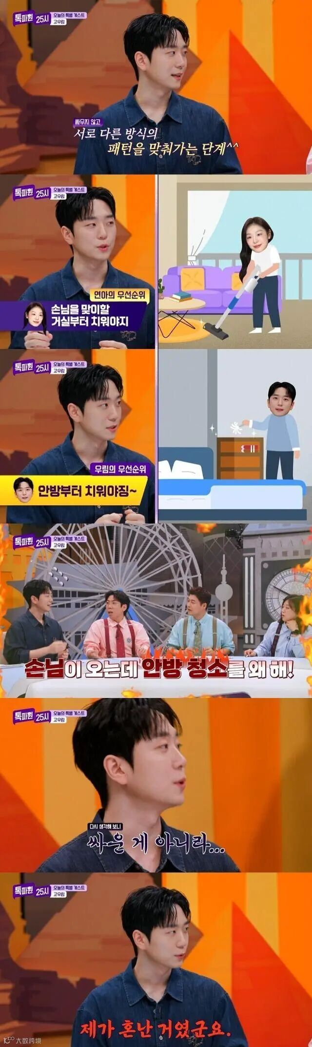 25일 방송된 JTBC '톡파원 25시'에 출연한 고우림은 "김연아와 다툰 적 있냐"는 질문에 “싸운 적은 없다”고 답했다. 다만 일상 속 서로 다른 습관으로 인해 조율 과정은 있다고 설명했다. 그는 "손님이 올 때 아내는 보이는 공간을 먼저 정리하지만, 나는 안방부터 청소하려는 성향이라 우선순위가 달랐다”고 말했다.
