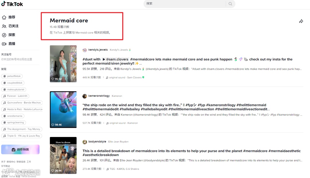 打开TikTok,截至5月30日,Memaid core相关视频已经获得了154亿播放量,相关标签#mermaid获得了151亿播放量,#mermaidcore已获得2亿1千800多万次观看,且仍在不断上涨中,流量迅猛惊人。