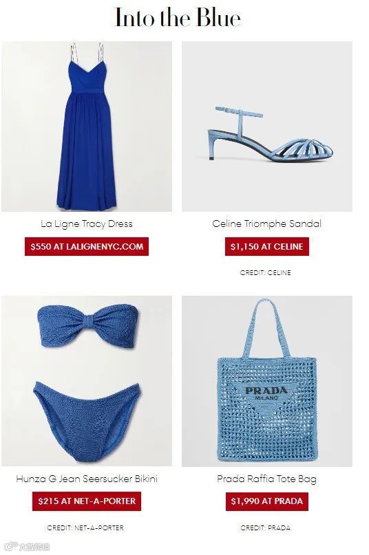 《时尚芭莎》在5月发表的《The Mermaid Aesthetic Is Already Ruling Summer 2023》(美人鱼美学已经主宰2023年夏季)中表示,“令人眼花缭乱的粉红色主宰的日子已经屈指可数了。日落色一直很受欢迎,但人们已经受够了——现在他们又开始转向蓝色,”Siboni 说。她预计下一个度假季会出现一波浅绿色、天蓝色和钴蓝色。