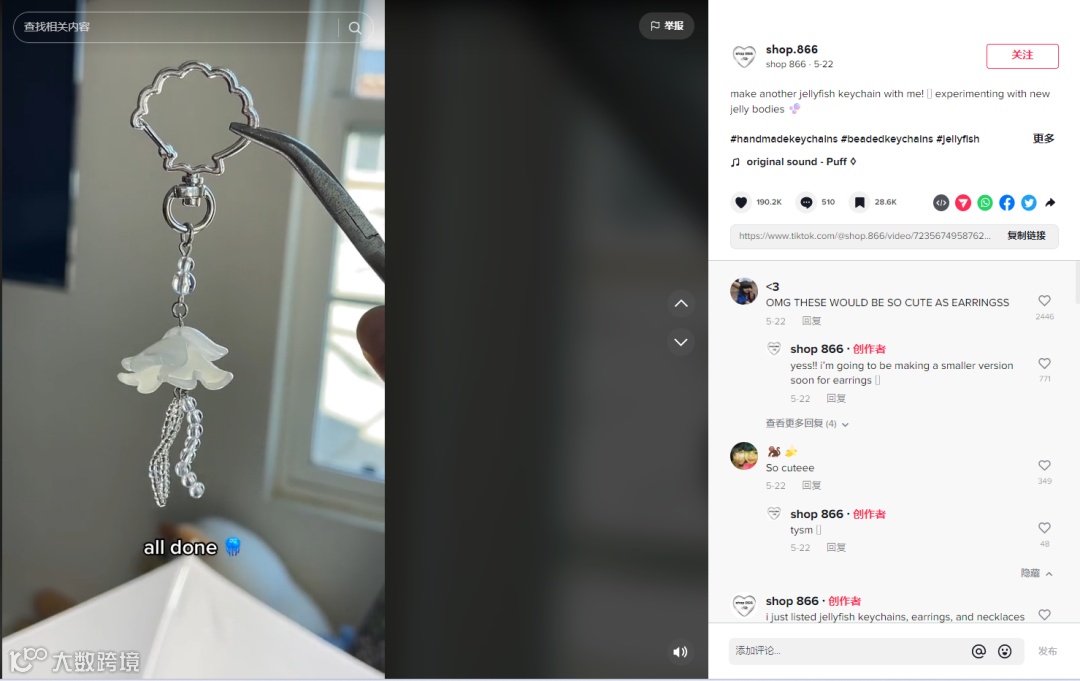 海洋、人鱼、贝壳元素的小饰品也在TikTok上走红,这款自制水母钥匙扣在该博主独立站售价30美元,同系列耳环售价45美元。