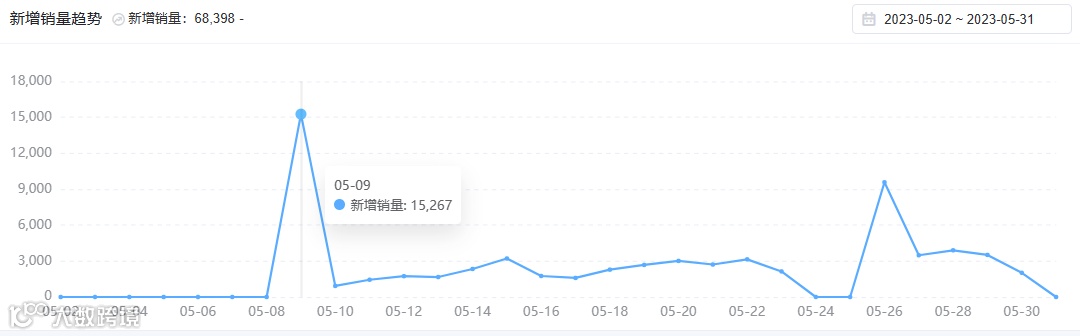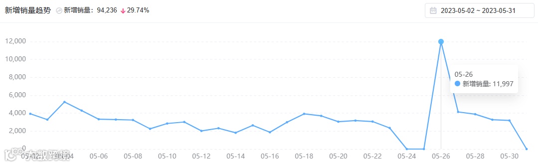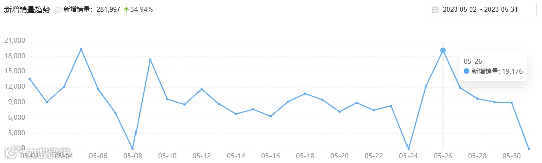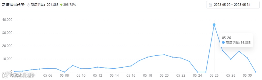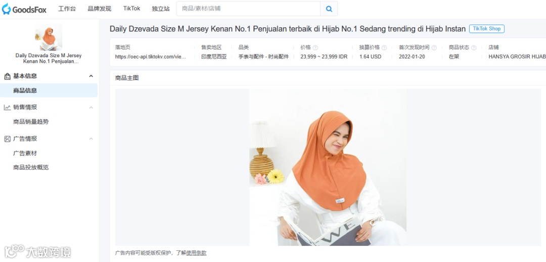 该款产品是由 HANSYA GROSIR HIJAB 推出的穆斯林女性头巾,目前产品上架于印尼小店,售价为23,999印尼盾(约合1.64美元)。从产品上看,该款头巾具备柔软舒适、透气防晒特点,适合在夏季穿戴。同时采用橘橙色,更具时尚和活力感,更受年轻消费者欢迎。进入5月份,该款产品的销量呈现上升趋势,最近30天狂销20万件。其中5月26日,商品日销量高达36,335件,单日销售额逼近6万美元。