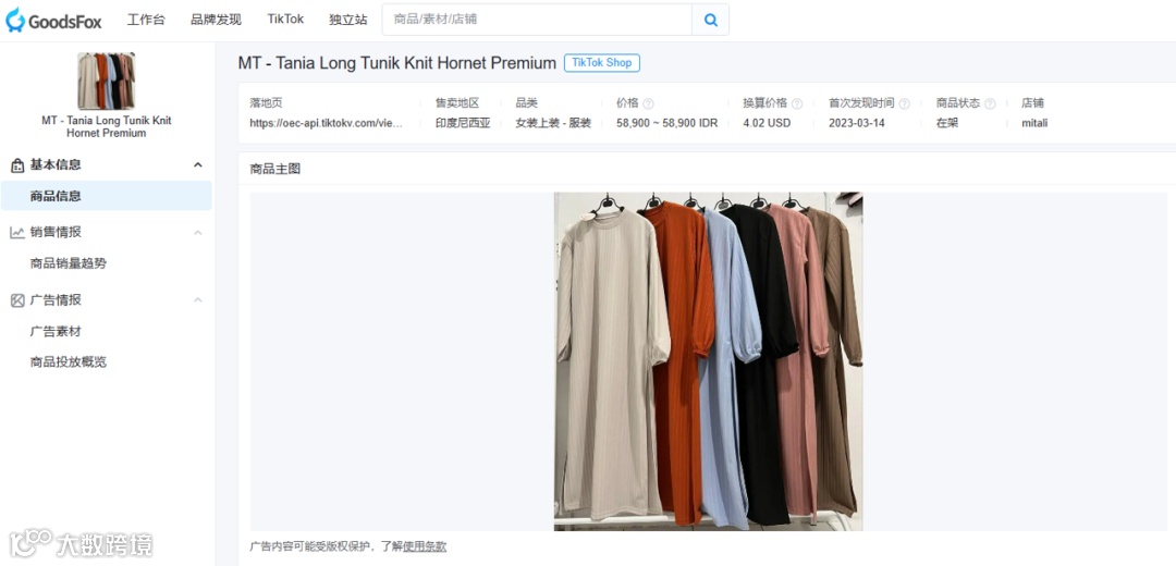 该款女性针织衫是由 mitali 推出,上架于印尼小店,产品售价为58,900印尼盾(约合4.02美元)。该款产品使用轻薄面料材质,具备轻盈透气特点。衣服采用竖条纹设计,呈现简约大方特点,适合多种场合穿着。同时提供6种颜色选择,满足不同消费者需求。目前该款产品在印尼小店上的销量表现稳定,平均没日销量能破千件。其中高峰期在5月9日和5月26日,销量分别达到15,267件和9,583件,最高日销售额突破6万美元。