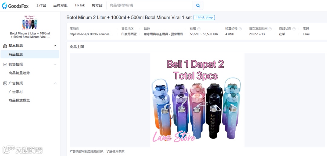 该大容量网红水瓶是由 Lami 推出,上架于印尼小店,产品售价为58,590印尼盾(约合4美元)。该类产品一直都是夏季的爆款单品之一,从去年就已经在 TikTok 上卖爆,今年夏季来临,产品热度表现依旧强势。该产品是一款包含2公升、1升和500毫升三种大小的水瓶套装。瓶口有绳子挂件,十分便于携带。此外,该款产品的一大特点是,瓶身采用丰富的渐变色设计,具备时尚和活力元素。销量上看,该款产品最近30天新增销量102,960件。其中在5月26日销量达到高峰,日新增销量9,893件,销售额逼近4万美元。