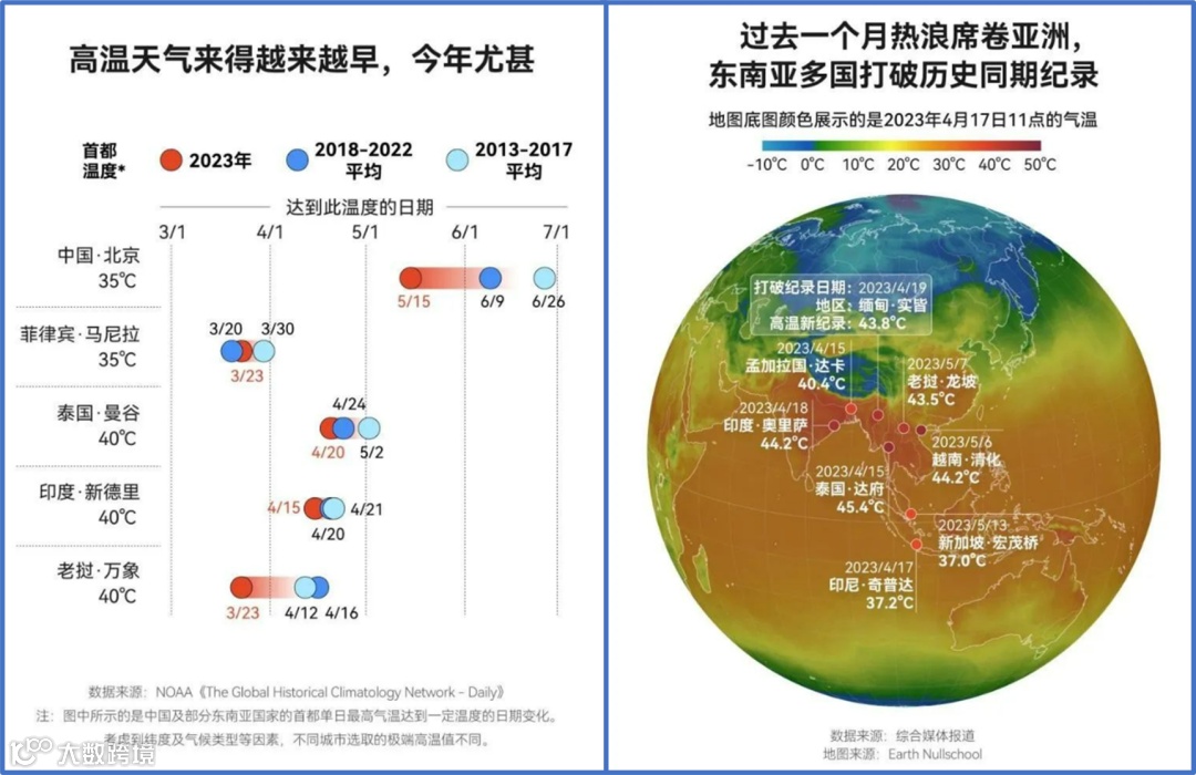 据澎湃新闻梳理数据显示,东南亚多个国家如越南、泰国、菲律宾等的高温天气在2023年有不同程度提前,甚至是在4月份就开始进入高温天气。如在新加坡最高气温升至 37 ℃(5月13日),泰国的曼谷、普吉岛等地气温也超过40℃(5月7日),居民体感温度甚至超过50℃。