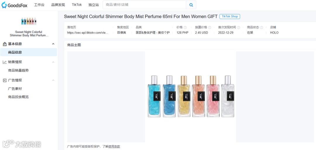 该款产品是由 HOLO 推出的清香喷雾型香水,上架于菲律宾小店,产品售价为128菲律宾比索(约2.45美元)。产品上看,该款香水均适合于男性和女性群体。产品拥有6种不同型号可选,包括运动型、花香型等,且香气最久能持续12小时。主打在夏季能够快速帮助除臭,并保持清新干爽的感觉。销量上看,该款产品最近30天新增销量94,236件。其中在5月26日销量达到高峰,日新增销量11,997件,销售额逼近3万美元。