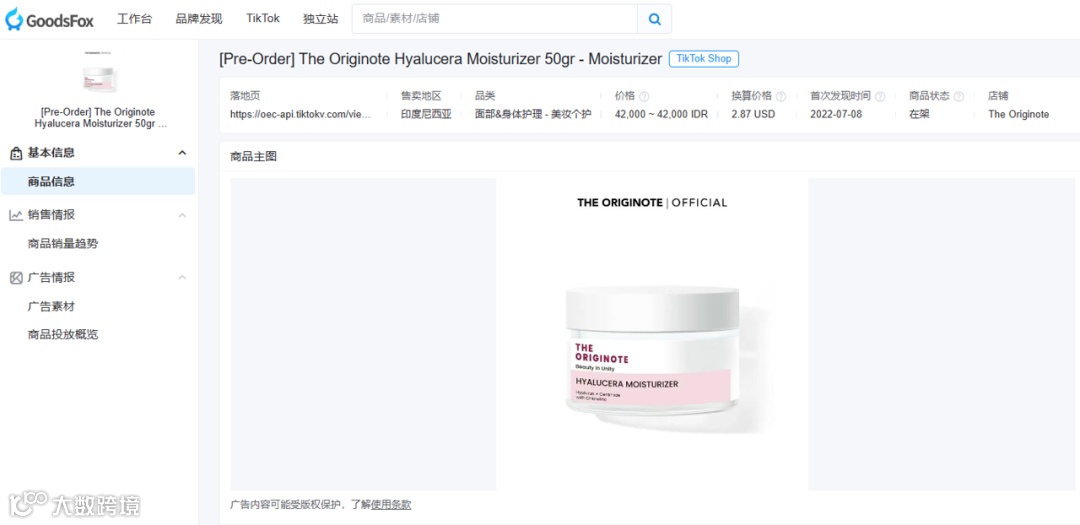 该款保湿霜由 The Originote 推出,目前是印尼小店的爆火美妆个护单品,产品售价为42,000印尼盾(约合2.87美元)。该款面部保湿霜含有透明质酸和酰胺等成分,可以修复肌肤屏障并保湿特性,在东南亚紫外线强烈的夏季十分适用。在销量方面,该款主打高性价比的产品在5月份持续爆火,近30天销量环比增长34.94%,新增销量281,997件。其中最近在5月26日有一轮销量高峰,新增销量超过19,176件,销售额超过5.5万美元。