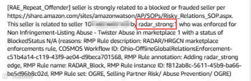 在体检报告中,备注的关联原因是“Radar(雷达)”。“Radar”不是一个具体的关联因素,而是一个判定关联的工具。亚马逊通过该工具来判定账户的关联。而通过这个工具判定的关联,则会在体检报告中备注工具的名称“Radar”,不会备注具体的关联因素。