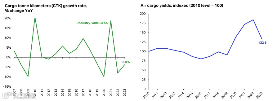 随着客运业务的复苏,航空货运在整个航空业总收入中的份额已从2021年的40%高位回落至2023年的18%。尽管如此,这仍高于疫情前约10%至12%的平均水平。