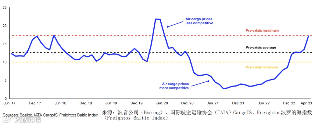 从2020年12月到2022年4月,海运货物收益率出现了三位数的年增长,而空运货物收益率在2021年增长了24%,在2022年增长了7%。然而,自2022年5月以来,海运价格的下降速度远远超过空运价格。截至2023年3月,集装箱收益率仅比2019年水平高出8%,而空运货物收益率仍比2019年高出45%。因此,目前空运已经失去了相对于海运的价格优势。
