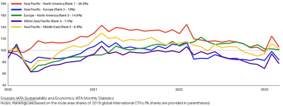 在全球主要贸易航线上,货运吨公里(CTKs)受到了不同程度的阻力影响。在2019年全球国际货运CTKs的前五大航线区域中,有三个航线区域在2023年第一季度的CTKs超过了2019年的水平,分别是亚太-北美航线(2019年国际货运CTKs的26.5%)、欧洲-北美航线和亚太-中东航线。