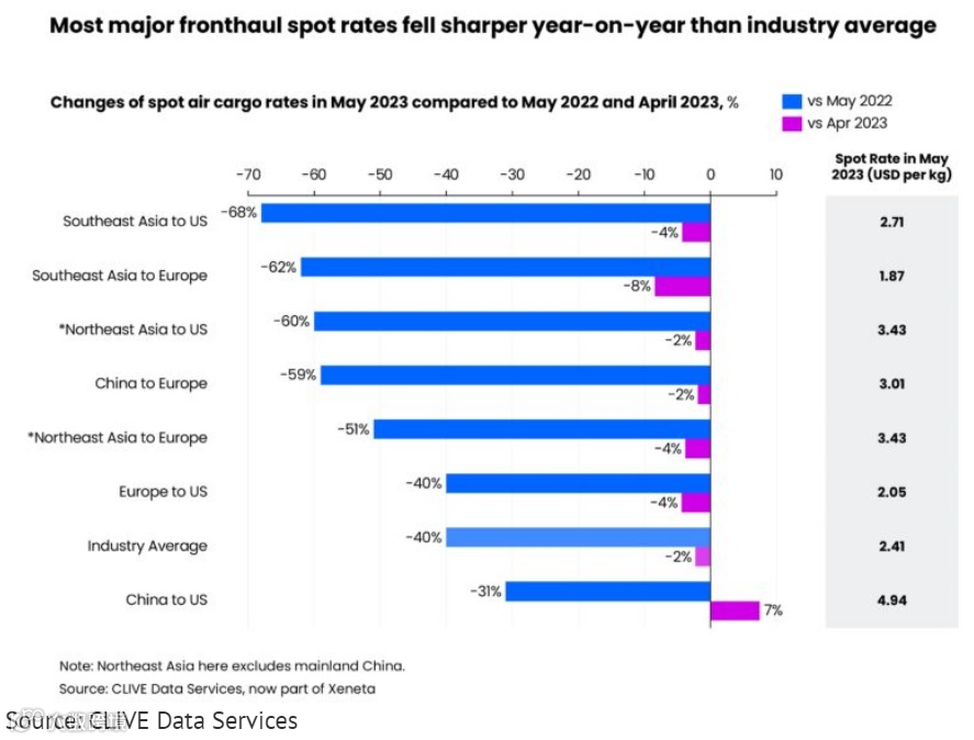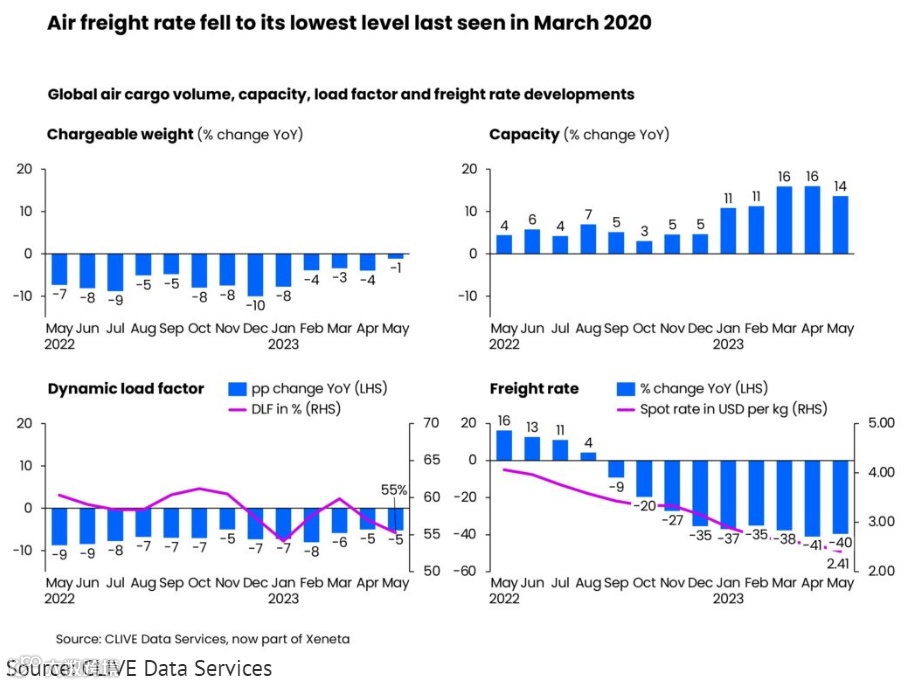 疫情以来,伴随着航运、空运市场的火热,货运企业赚取了高额利润,并借此收购一些细分行业的优势物流公司,加强全球物流布局和经营能力。但如今随着市场货量发生变化,货代企业面临着新的挑战。Xeneta的首席空运官Niall van de Wouw表示:“市场上有很多雄心勃勃的货代企业都想要发展,但由于需求的下降,使得货代企业无法在现有客户群的基础上实现增长。正如我们强调的,货代企业正在从其他公司那里寻求获得更大的份额。”根据Xeneta旗下克莱夫数据服务公司CLIVE Data Services的市场分析发现,5月,全球航空货运现货价格较上年同期下降了40%,跌至2.41美元/公斤,超过自2020年3月以来的最低水平。而据国际航空运输协会(IATA)预测,航空货运的收入和收益在2023年可能将会分别下降31%和29%以上。全球航空货运需求方面,5月份收费重量较上年同期下降幅度较小,为-1%,这是过去12个月中的最小月度降幅,但客机腹舱运力的增加给运价带来了更大压力;货运运力方面,5月则继续保持两位数增长,达到14%。但需求减少和运力增加会不可避免地导致动态载重系数的下降(动态载重系数是CLIVE衡量全球运输货物的体积和重量以及可用运力的指标)。与2022年5月相比,动态装载因子同比下降了5个百分点,达到55%。