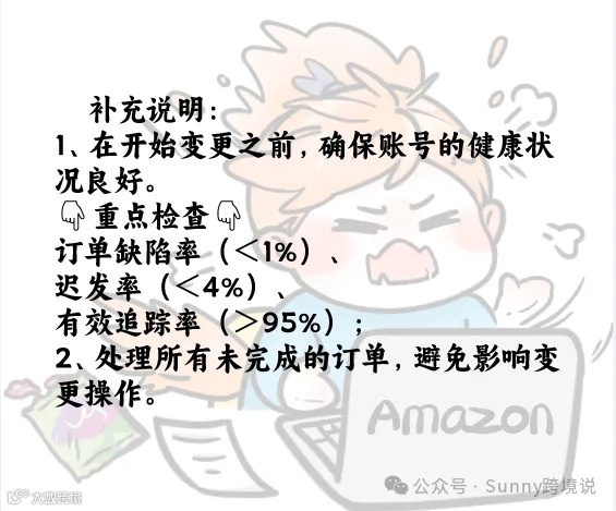 1、变更期间暂停自发货(FBM),优先使用FBA维持绩效。