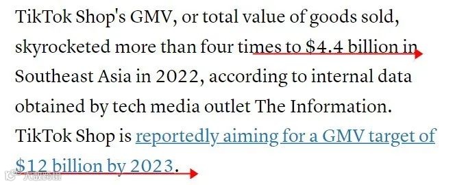 据科技媒体 The Information 的内部数据显示,2022 年 TikTok Shop 在东南亚的 GMV 达到了44 亿美元,增长了四倍多。而2023年,TikTok Shop更是直接在东南亚定下了120 亿美元的GMV目标。