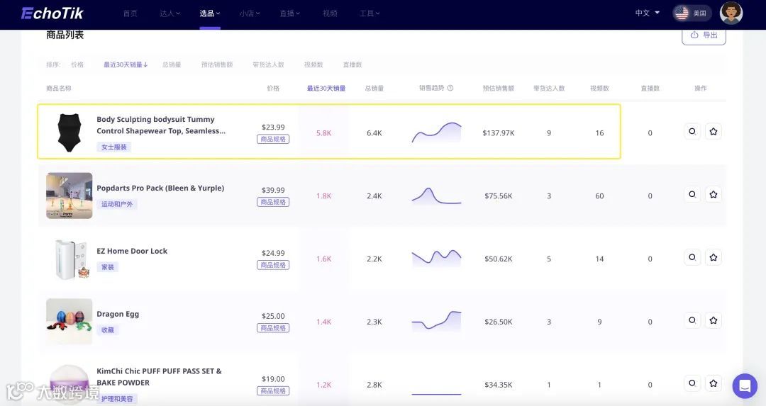 通过第三方数据选品工具EchoTik(https://echotik.live)发现,在TikTok Shop美国闭环小店中,最近30天销量排名第一的单品是Soo Slick的塑身衣,来自同名店铺Soo Slick。根据近7日销量趋势判断,销量仍有进一步增长的空间。