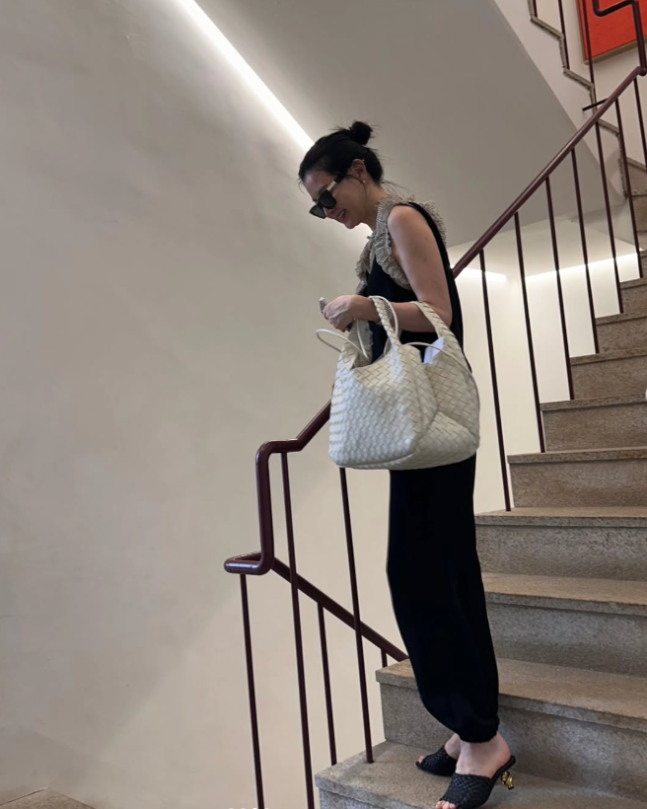 공개된 사진 속 이영애는 블랙 컬러의 민소매 톱과 팬츠를 매치한 올블랙 스타일링에 화이트 컬러의 백으로 포인트를 더했다.