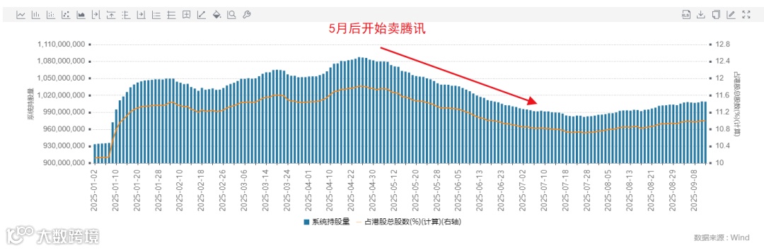 我又去看了其他的核心公司,比如腾讯。很奇怪的是,南向资金从今年5月开始就不断卖腾讯,持股数量从1.09亿股卖掉最低0.98亿股,减持了约10%。而且对比上图很明显地看到,南向资金是在减仓腾讯的同时,大幅增持美团的,很可能就是“卖腾讯买美团”了。这笔交易让人摸不着头脑,当时腾讯有啥重大利空吗?