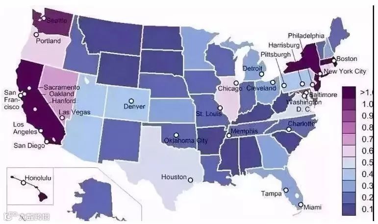 从地域分布来看,华裔主要集中在加州、纽约州和德州等大都会地区。维基百科发布的在美华人分布图直观地显示了这些区域的人口密集程度,颜色越深代表华人数量越多。