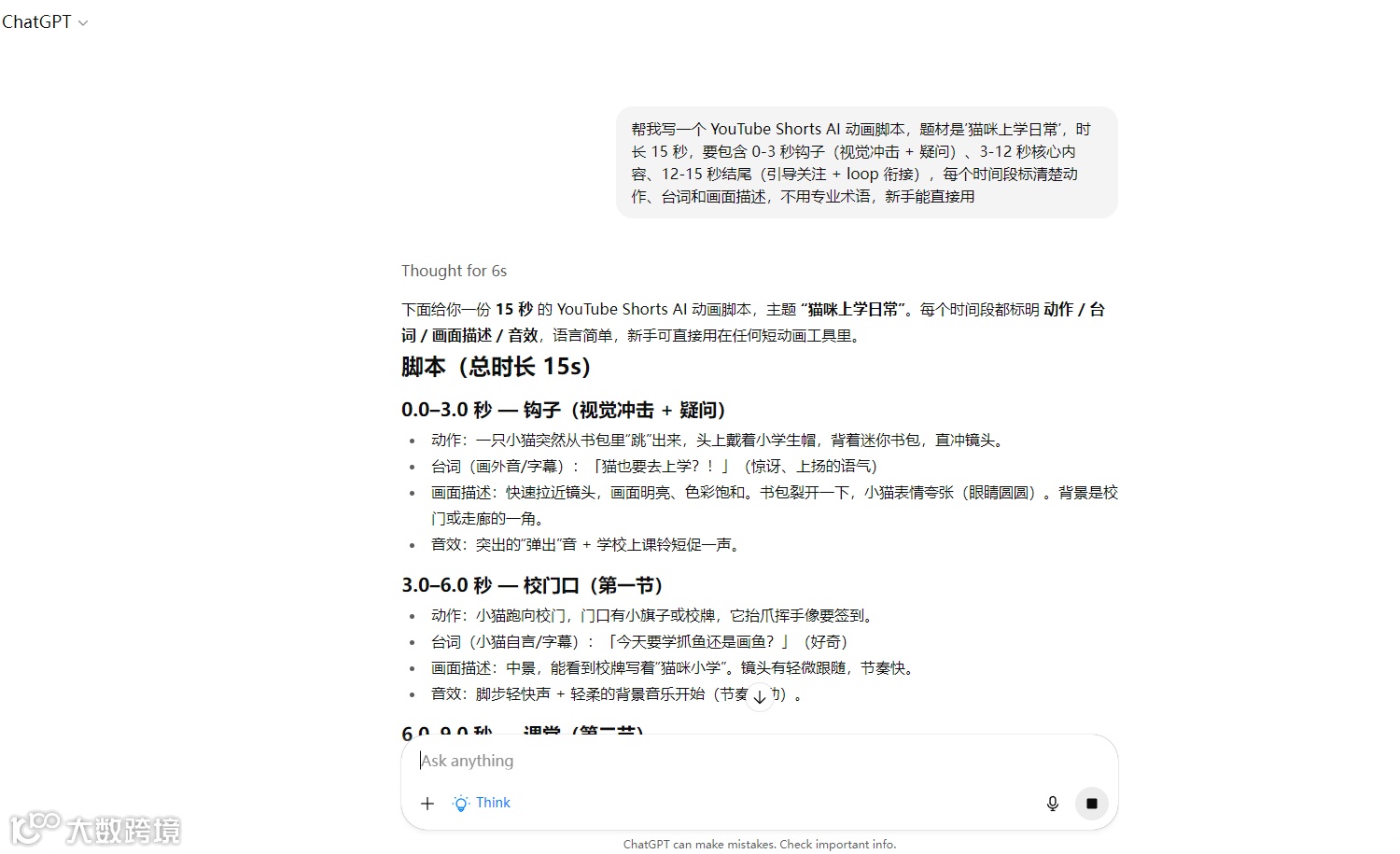 新手完全不用纠结 “脚本分镜怎么设计”,靠 AI 就能快速出可落地的方案,核心还是围绕 “钩子 - 核心内容 - 结尾闭环” 的结构,但全程不用自己想细节 —— 打开 ChatGPT 或 Claude,直接输入指令:“帮我写一个 YouTube Shorts AI 动画脚本,题材是‘猫咪上学日常’,时长 15 秒,要包含 0-3 秒钩子(视觉冲击 + 疑问)、3-12 秒核心内容、12-15 秒结尾(引导关注 + loop 衔接),每个时间段标清楚动作、台词和画面描述,不用专业术语,新手能直接用”。