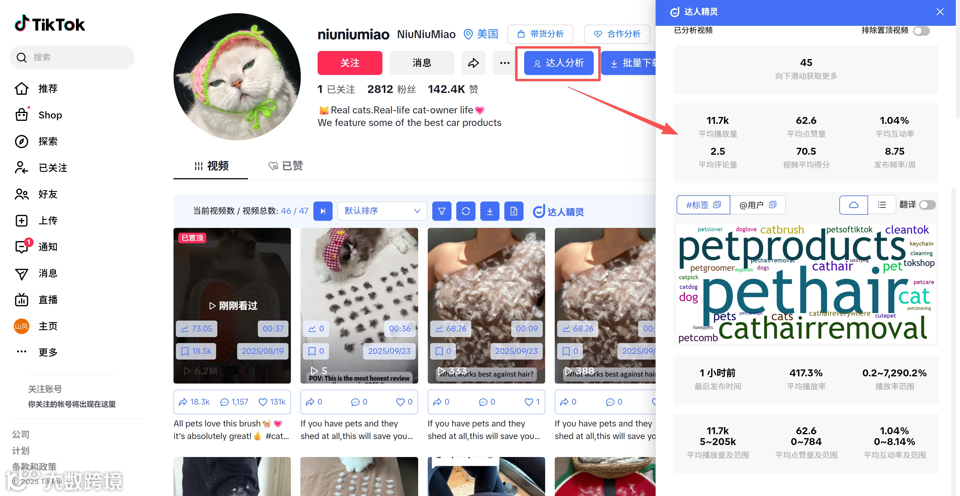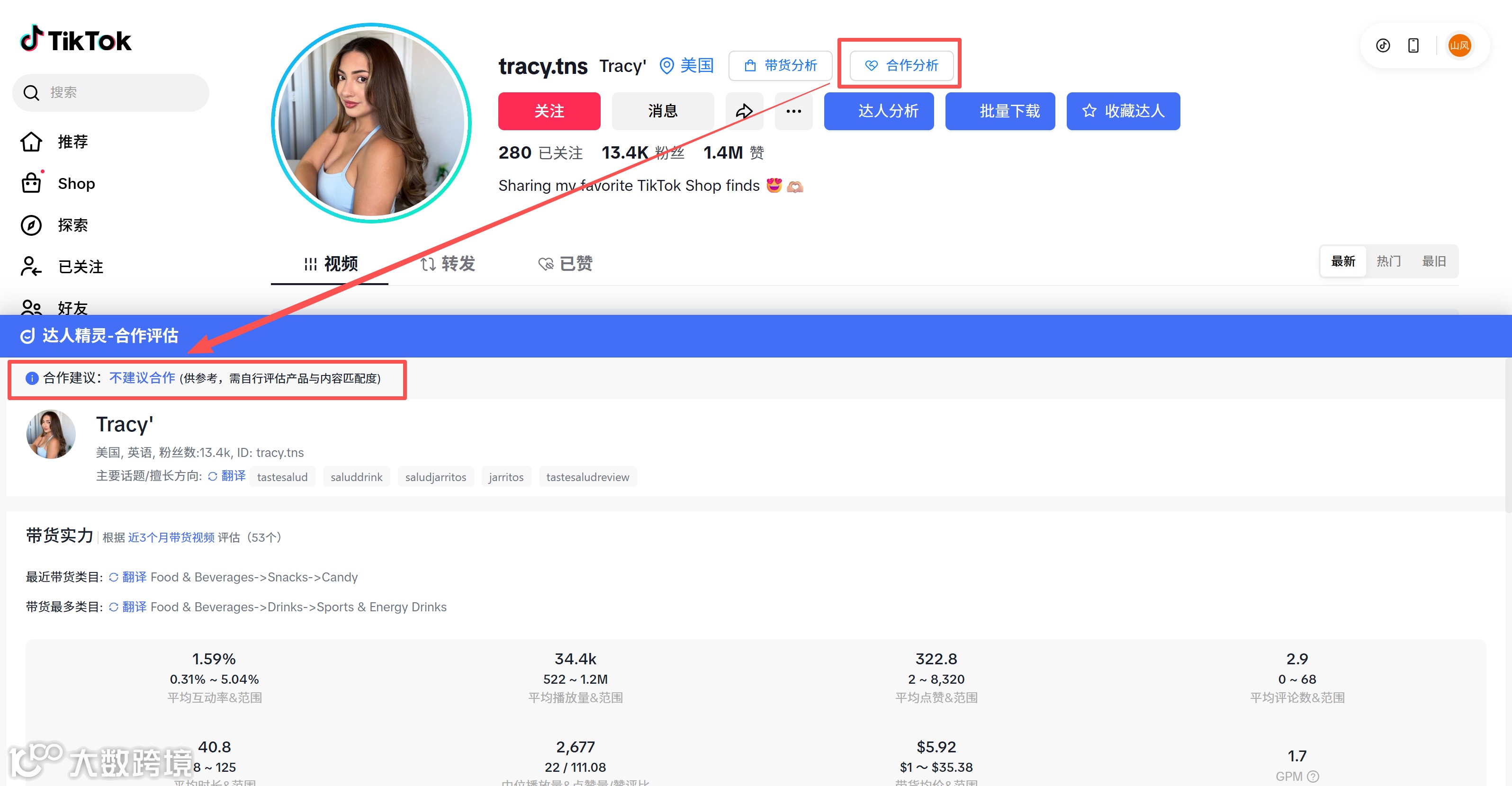 目前业内领先的TikTok运营工具已能提供多维度的达人分析,值得一提的是,作为专为TikTok跨境卖家打造的智能营销助手:达人精灵,最近上线了新功能:合作分析。