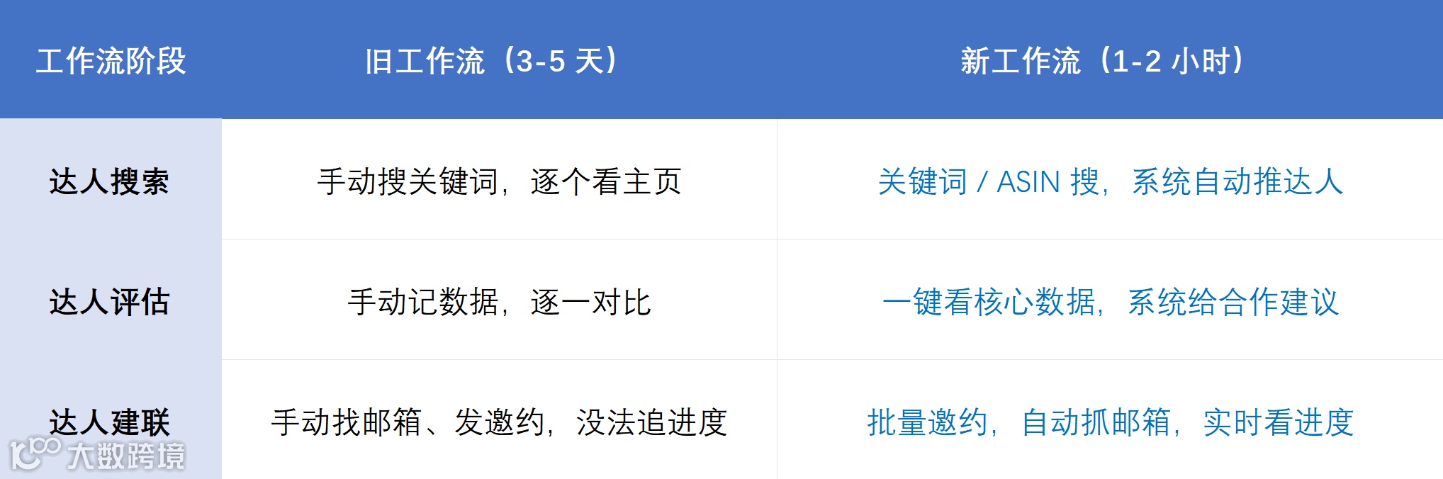 • 传统方式:人工搜索、邮件联系、Excel跟踪,耗时3-5天/轮,且无法有效追踪已读/回复状态。